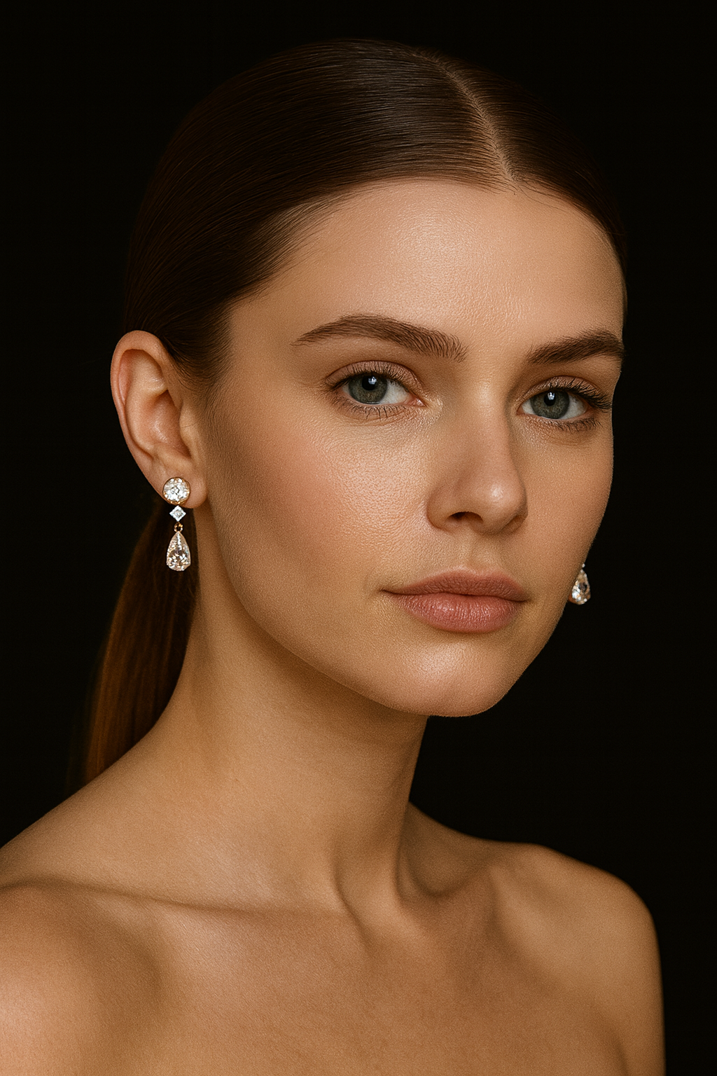 Aretes compuestos por tres piedras de zirconia, elaborados en oro fino de 10 quilates, con una longitud de 3.5 cm.
